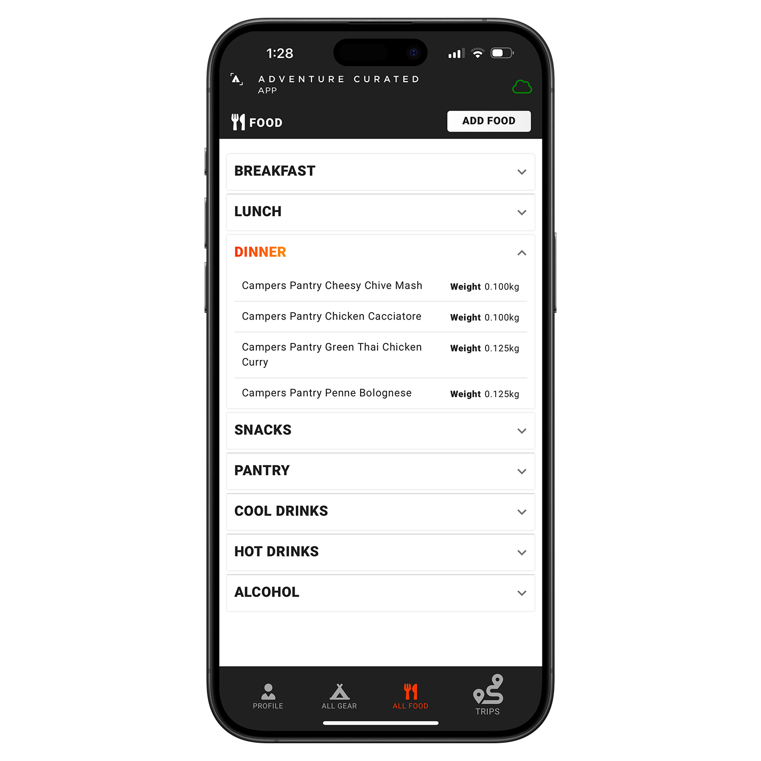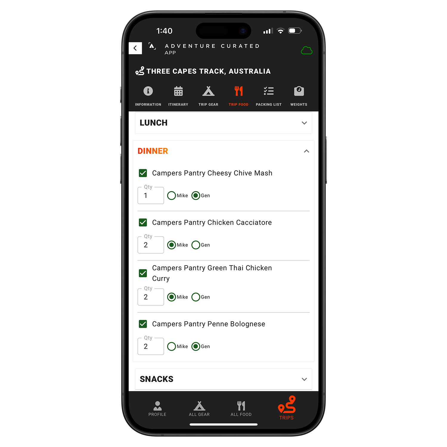 » Similar to the trip gear function, simply add the food, water and fuel you'll need for each trip based on duration and factors like water availability and weather.