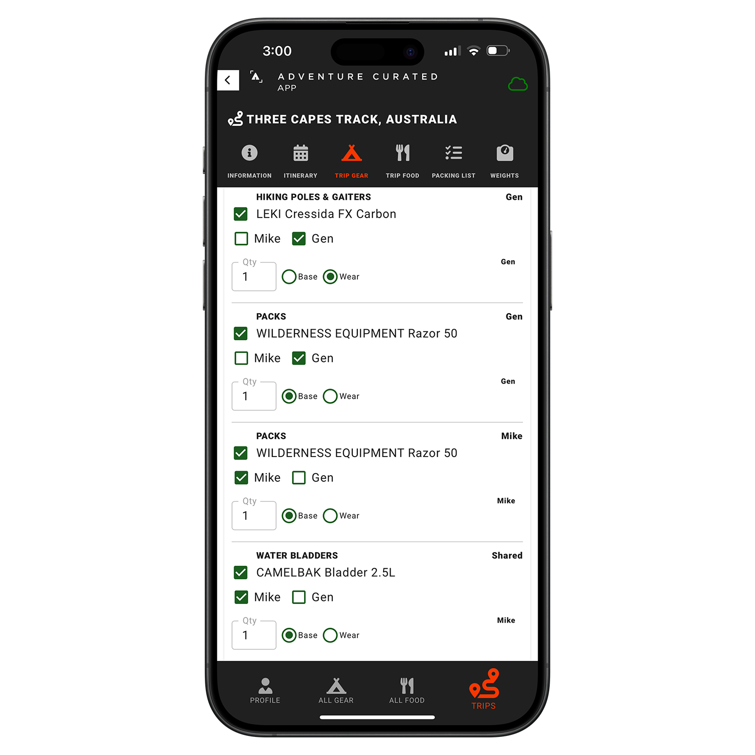 » Organise and catalogue your gear ready to effortlessly add to all future trip packing lists.