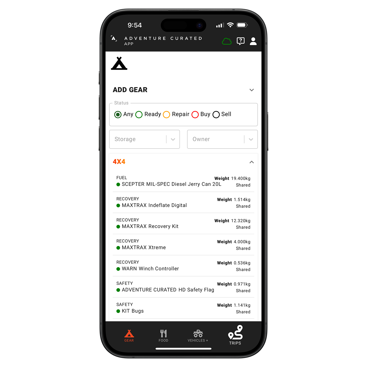 See your full gear and consumables packing list. Check the status of each gear item: green for ready, orange for repair and red for buy.
