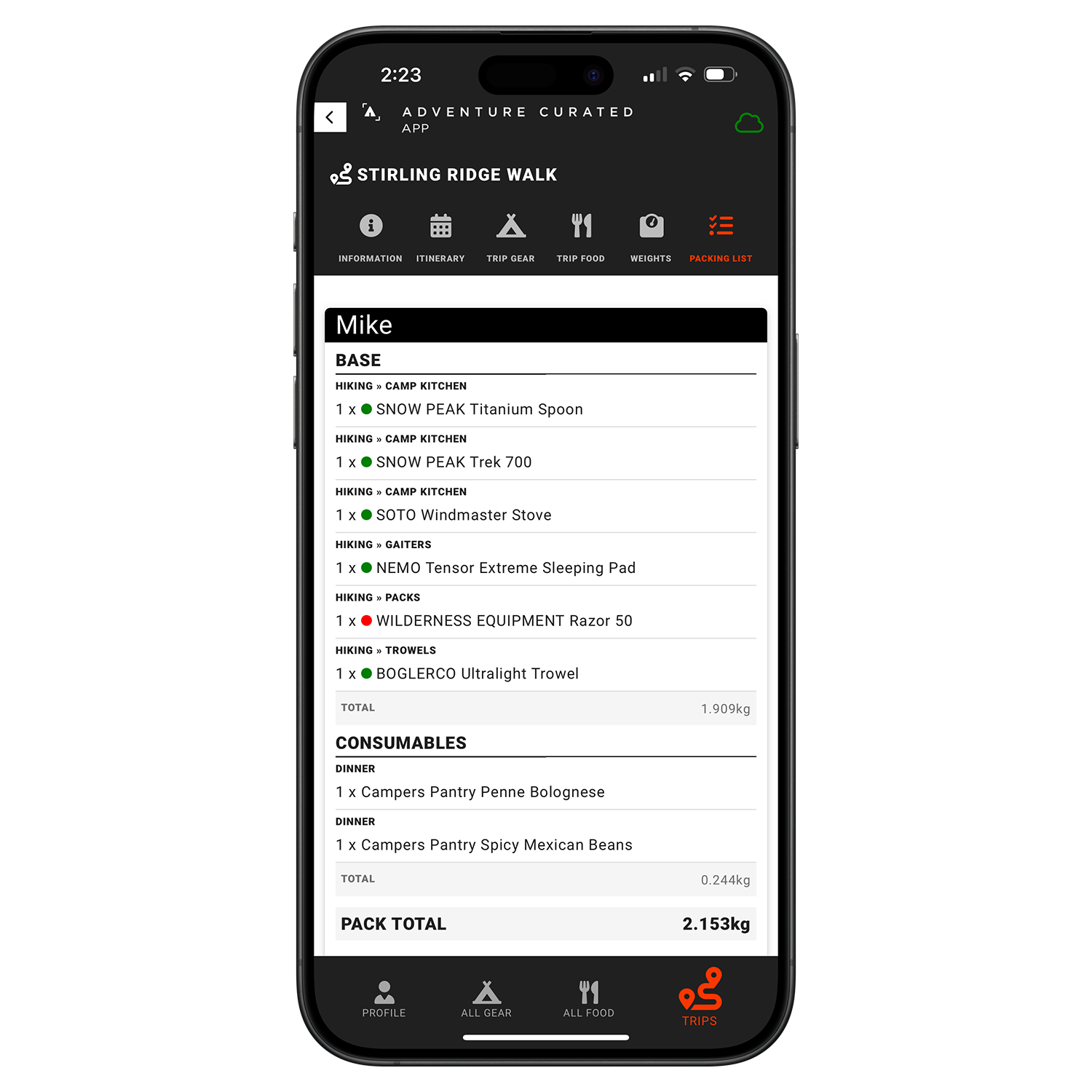 » Add items as kits for simplicity and list the contents of each kit to stay organised.» Gear is showing as either base weight or wear weight depending on the location chosen when packing.