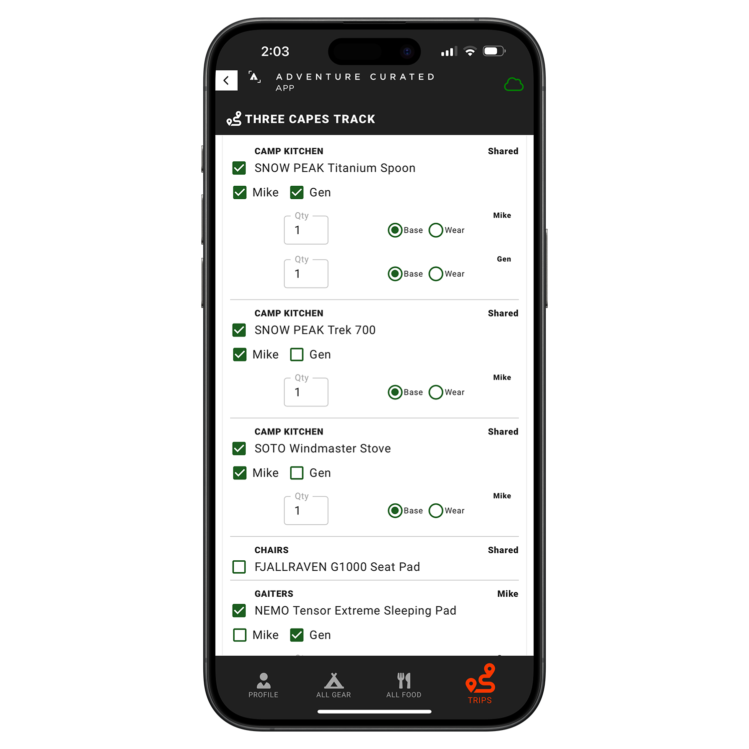 Setup up your Gear Shed and Pantry once to make Packing Lists tailored to the destination, weather and duration in no time. Explore often and with the confidence that comes from being prepared.
