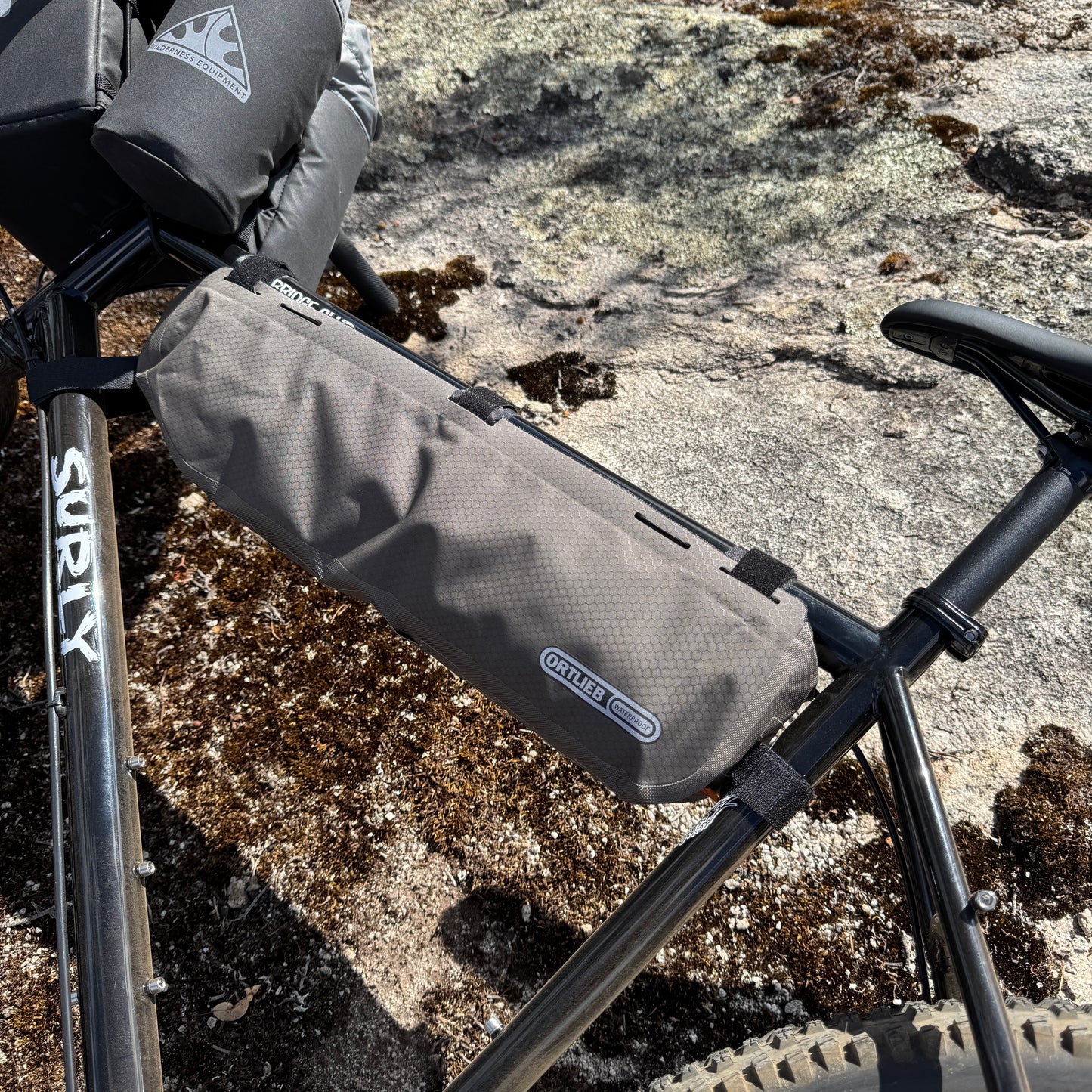 It provides plenty of space for heavy equipment such as tent poles, tools and food while also helping to secure a low centre of gravity. And given that the bag and its Tizip zipper are waterproof, you can even cross rivers on your bikepacking trip without worrying about your stuff getting wet.