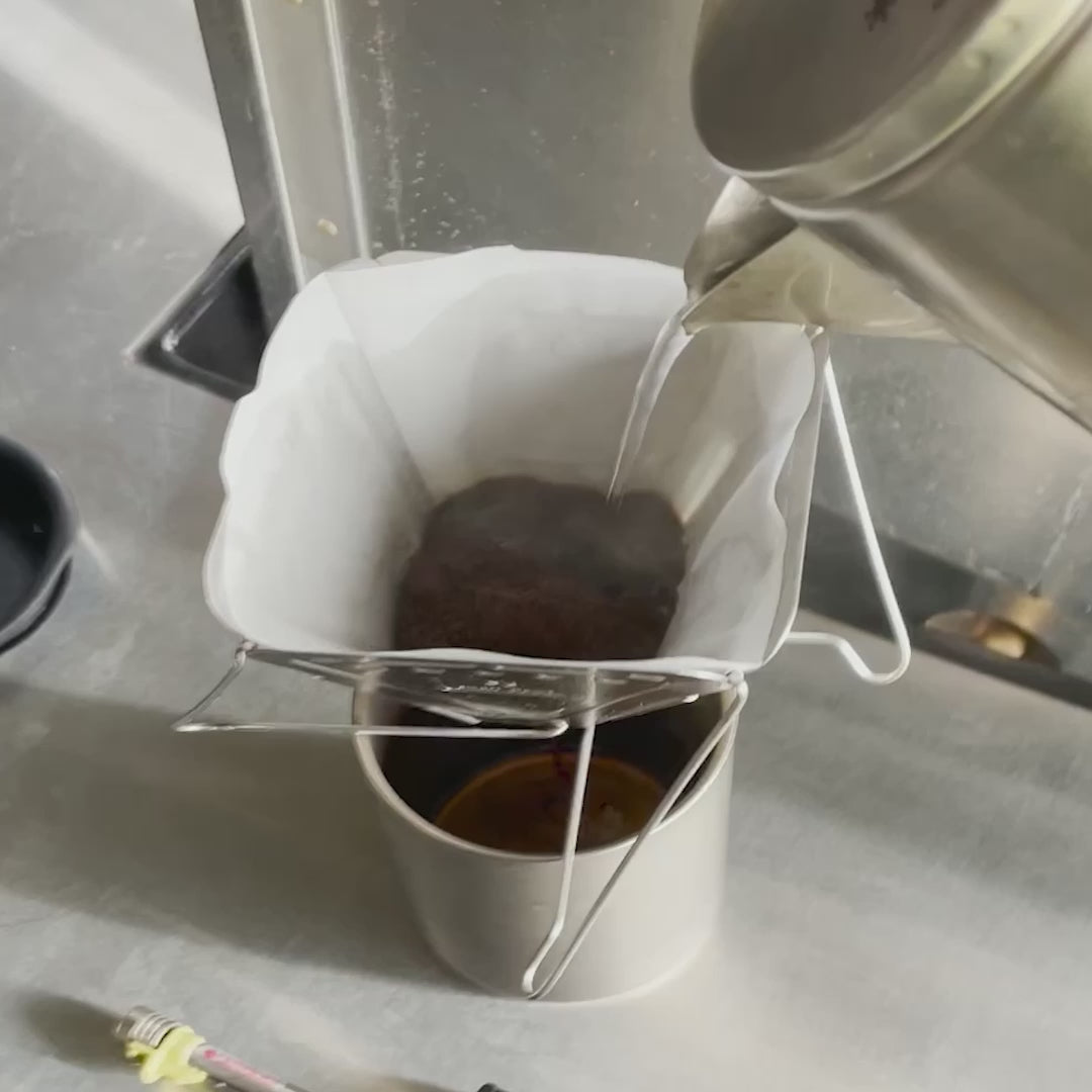 The Snow Peak Collapsible Coffee Drip brews delicious coffee before folding flat for easy storage in your coffee kit.